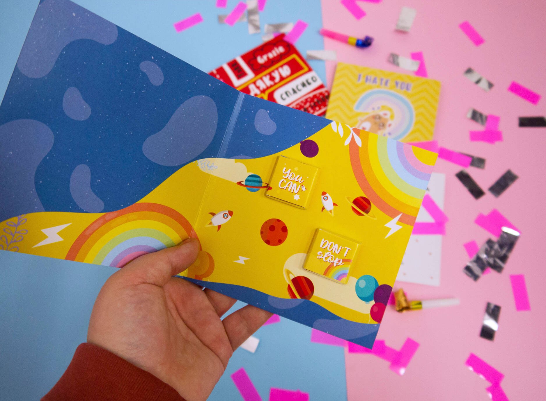Ось, що ми помітили: люди люблять листівки, а ще вони люблять шоколад. "Еврика!" - вигукнув наш креативний директор і помчав створювати макет нового подарунка - листівки-шоколадки.